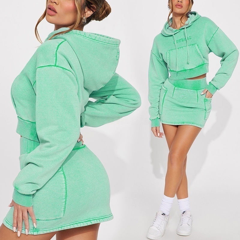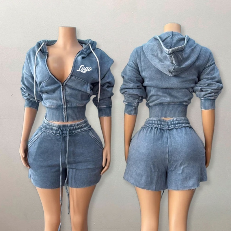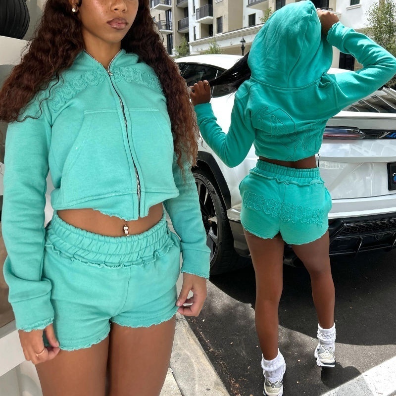 Appliqué Embroidered Hoodie Set: Women's Cropped Zip-Up 100% Cotton French Terry