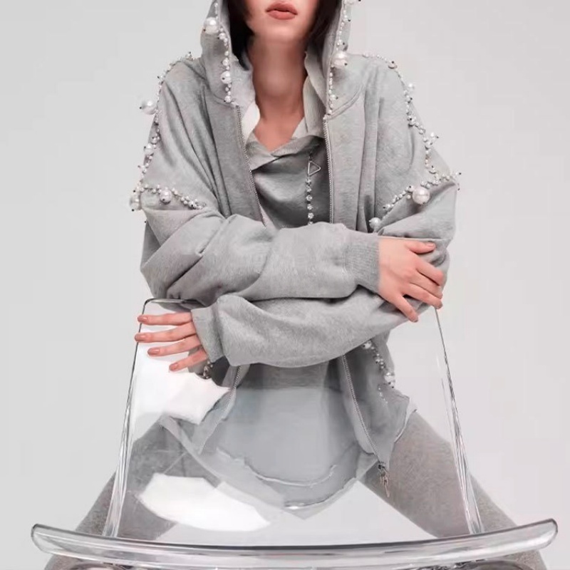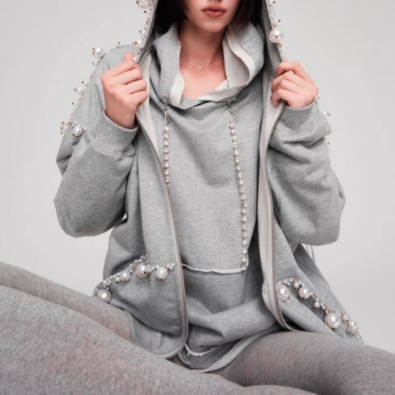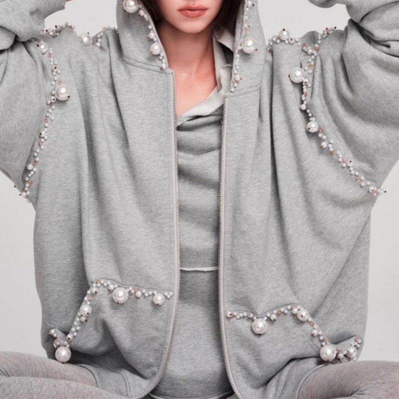 Pearl Accented Zip-Up Heavyweight Oversized French Terry 100% Cotton Women's Hoodie