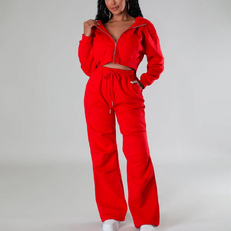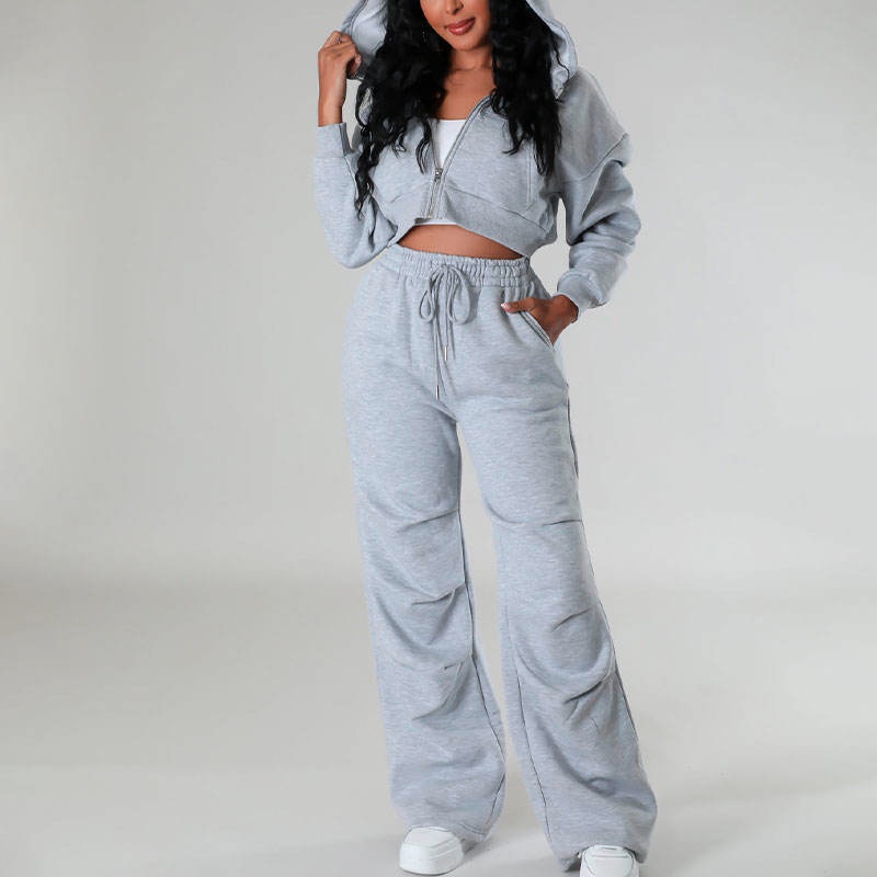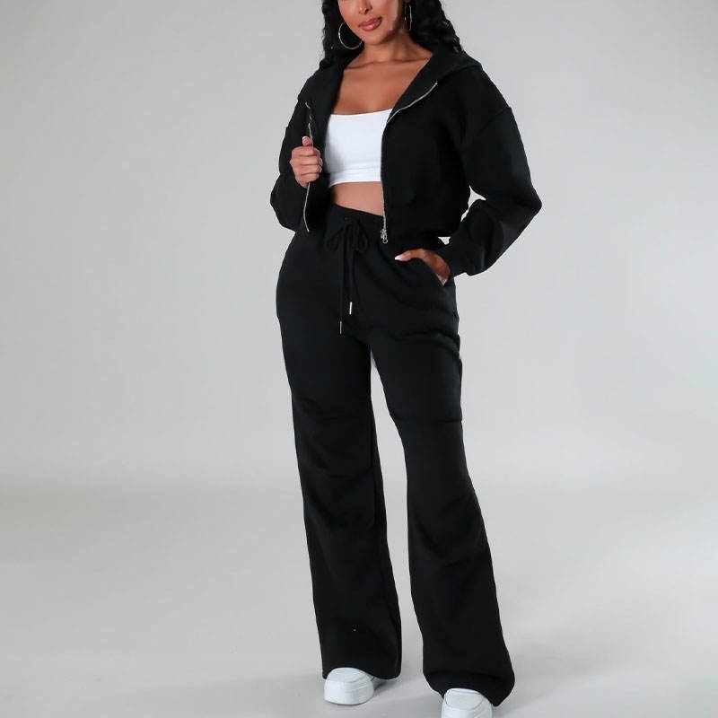 Zip Solid Color French Terry Cropped Hoodie and Sweatpants 100%Cotton Women's Hoodie Set