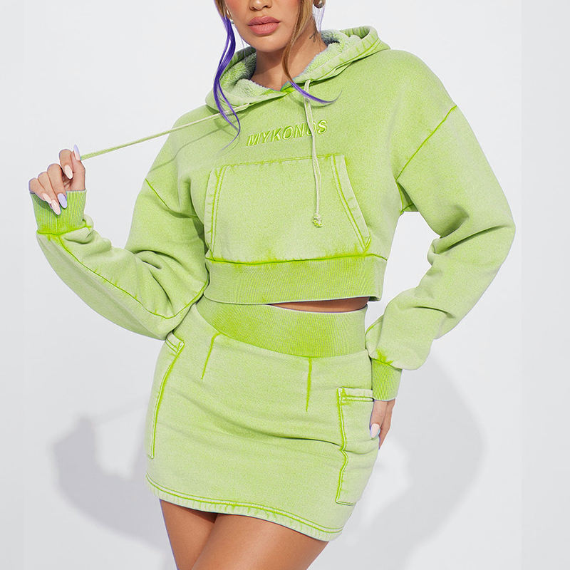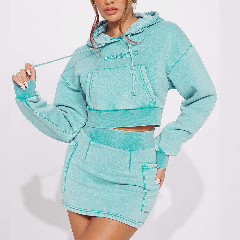 Embroidery Acid Wash Heavyweight Cropped Hoodie and Skirt 2-Piece Set Women's Hoodie Set
