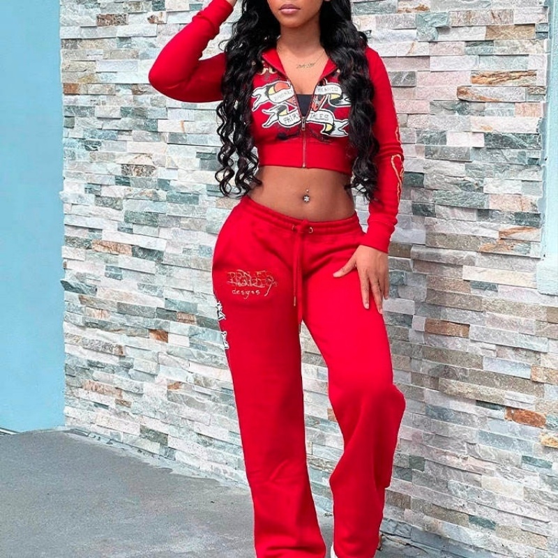 Foil Print Heavyweight Wool Zip Fitted Cropped Hoodie and Sweatpants Women's Hoodie Set