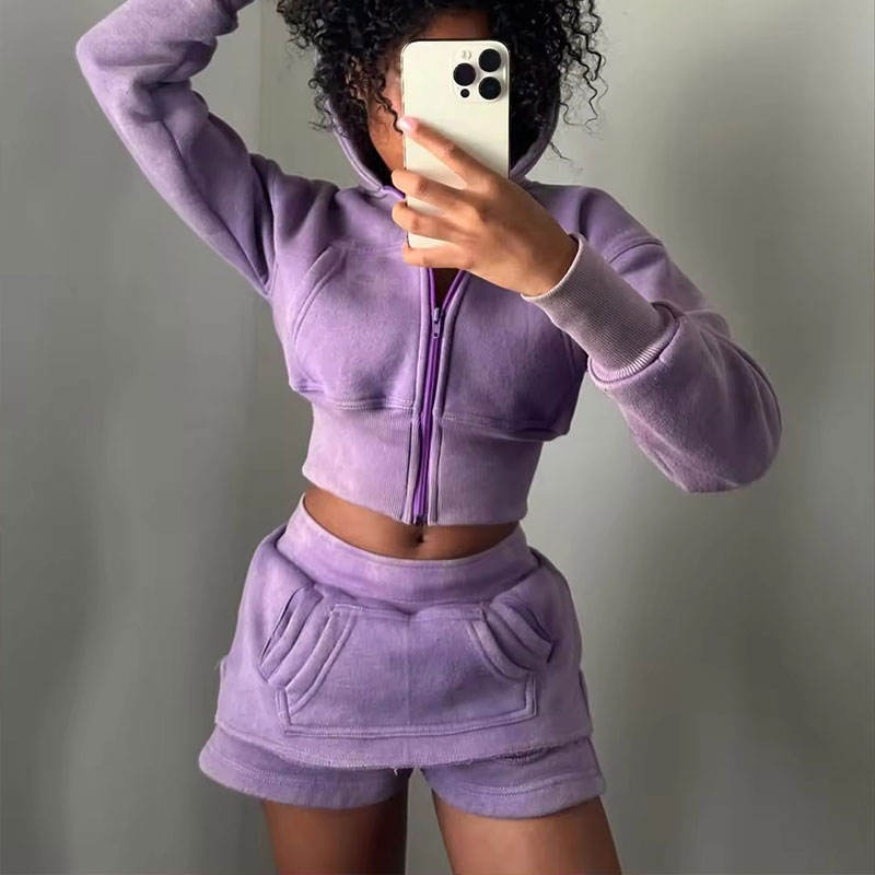 Custom Logo Vintage Wash Heavyweight French Terry Zip-Up Cropped Women's Hoodie Set