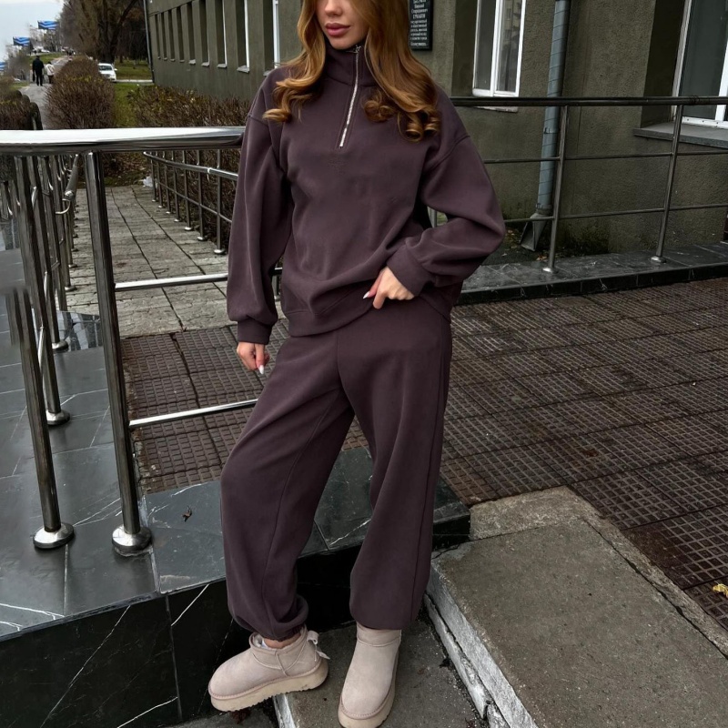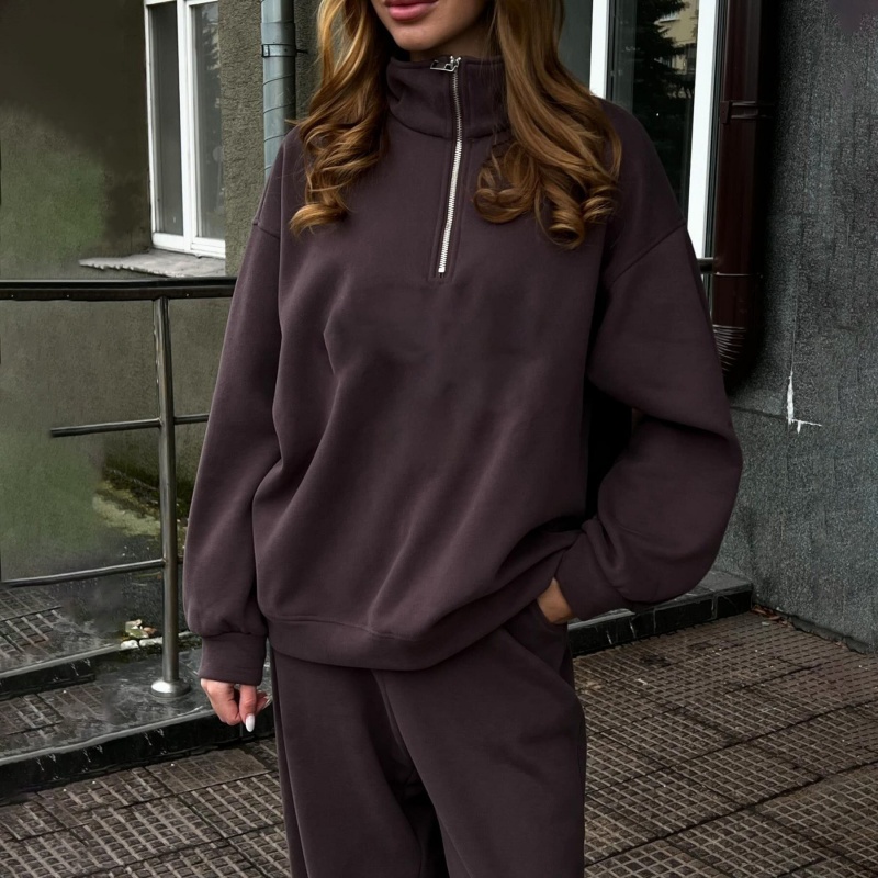 Brown Ribbed Collar Quarter Zip Sweatshirt for Women Casual Loose Fit Pullover Streetwear Women's Hoodie Set