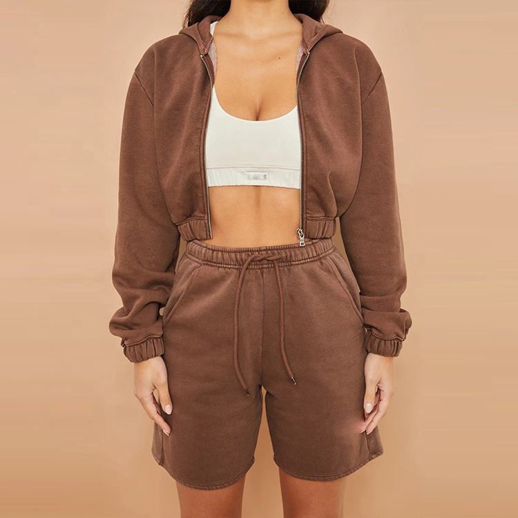 French Terry Hoodie Set Y2K Style Embroidery Zip-Up Cropped 2-Piece Women's Hoodie Set