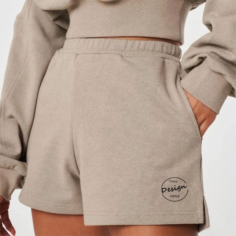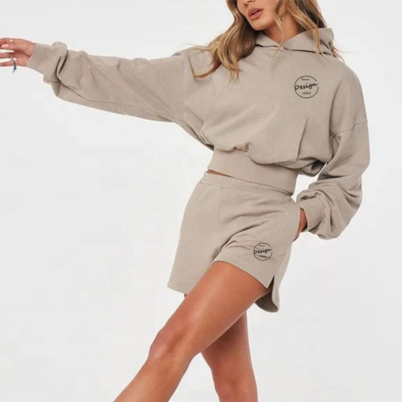 2025 Wholesale Custom Crop Top Tracksuit Sweatsuit Solid Kangaroo Pocket Pullover Side Pocket Shorts and Cropped Women's Hoodie Set