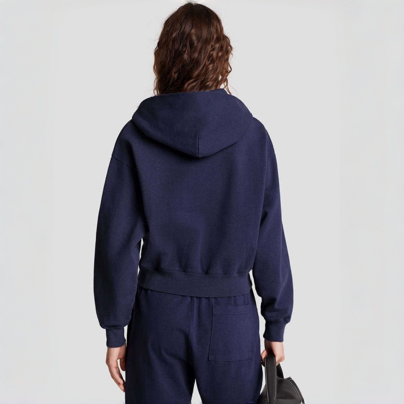 Full Zip Set Two Piece Outfit Long Sleeve Crop Navy Color Sweatshirt with High Waist Shorts Casual Women's Hoodie Set