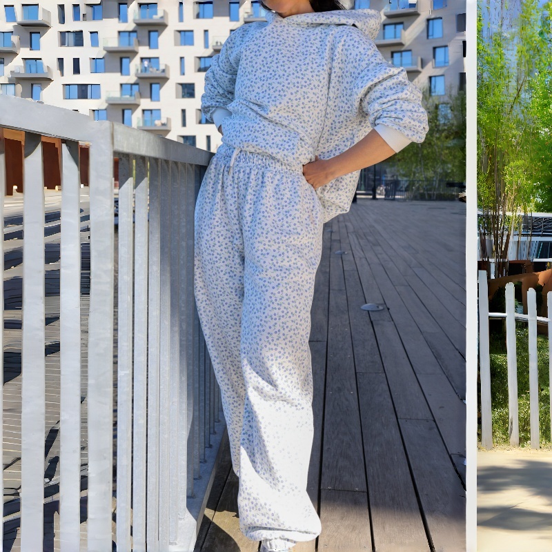 High Quality Casual Daily Wear Solid Flower Printed Sweatpants and Hoodie with Pocket Custom Pajama Suit Women's Hoodie Set