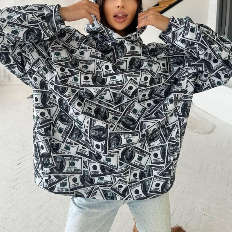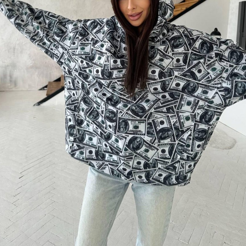 High Quality Money DTG Print Oversized Pullover Sweatshirt Custom All Over Dollar Pattern Hip Hop Streetwear Women's Hoodie