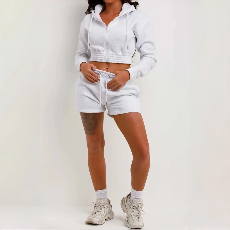 Casual Crop Top & Cozy Shorts Set Custom Logo Zip-Up Sweatsuit Drawstring Embroidered Technique Zipper Decoration Women's Hoodie Set