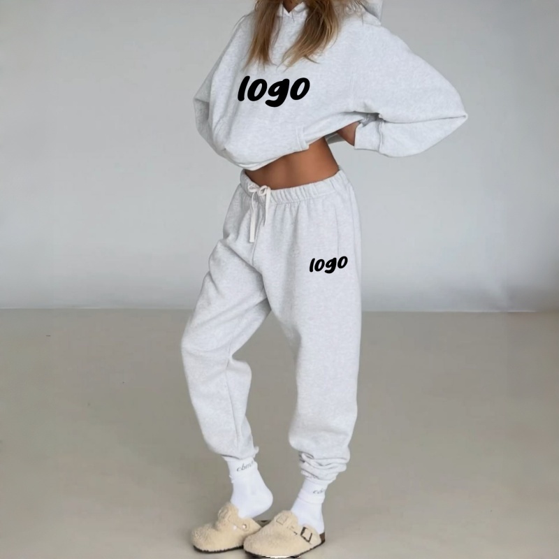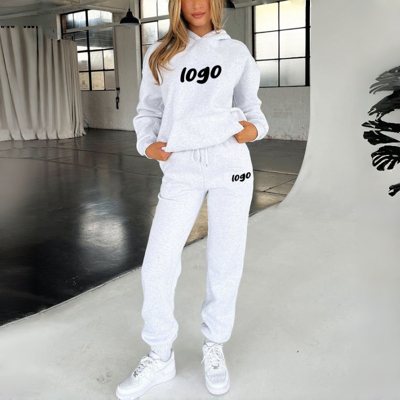 Solid White Kangroo Pocket Pullover Sweatshirt Custom Logo Puff Printing Embroidered Technics for Winter Women's Hoodie Set