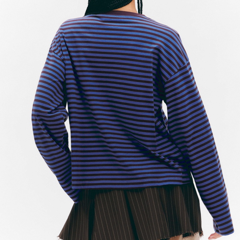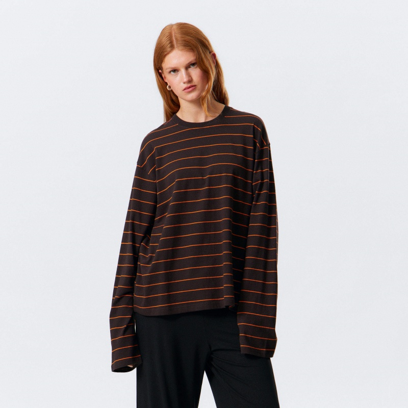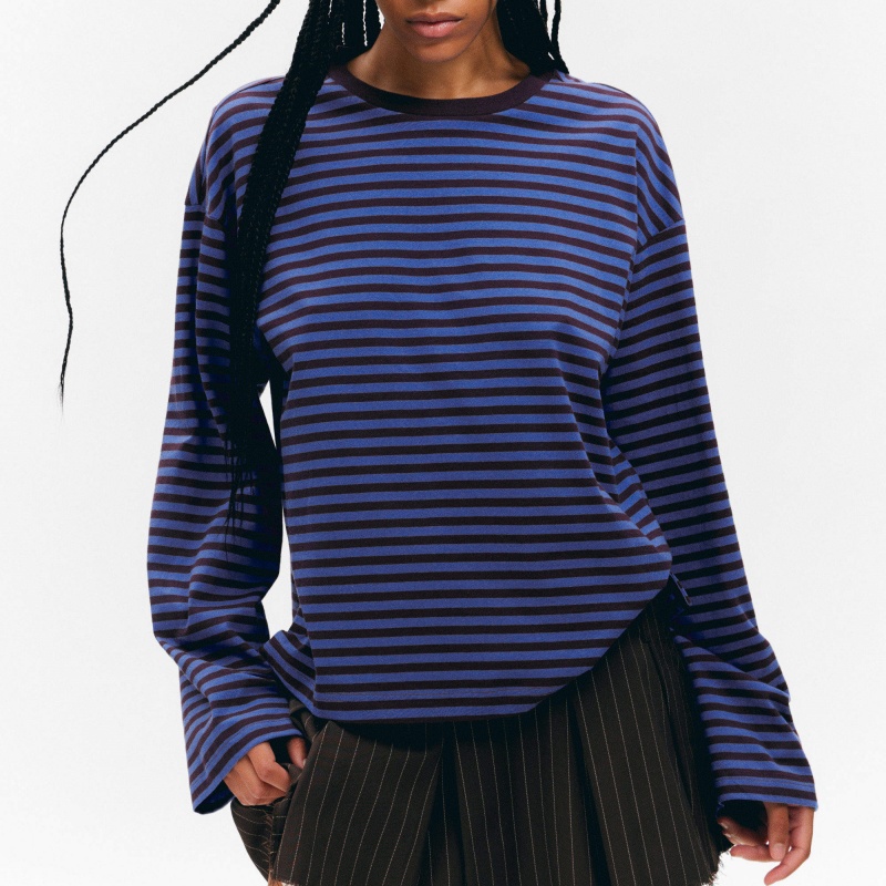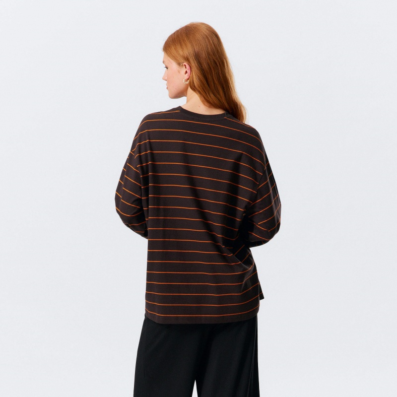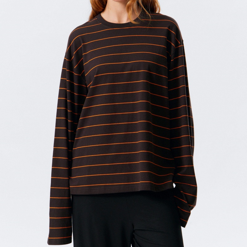 Brown Stripe Long Sleeve T-Shirt Multi-GSM Cotton Loose Top Women's Hoodie
