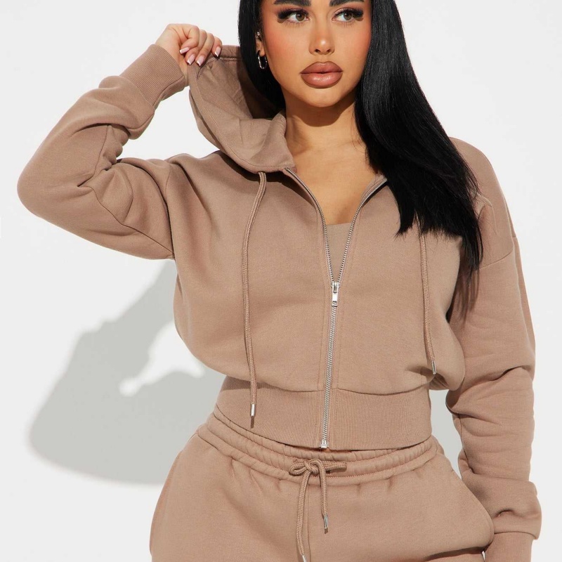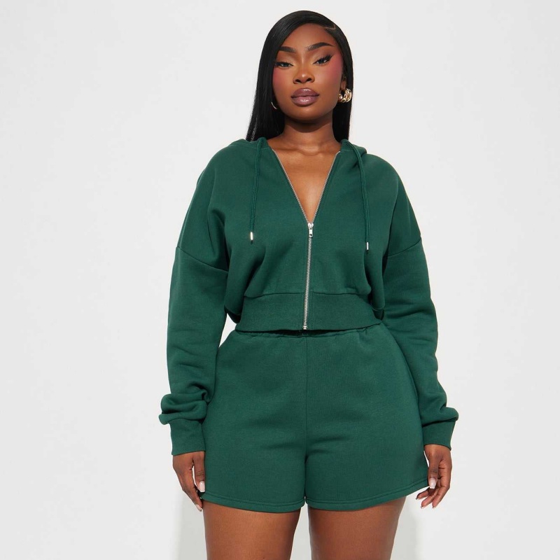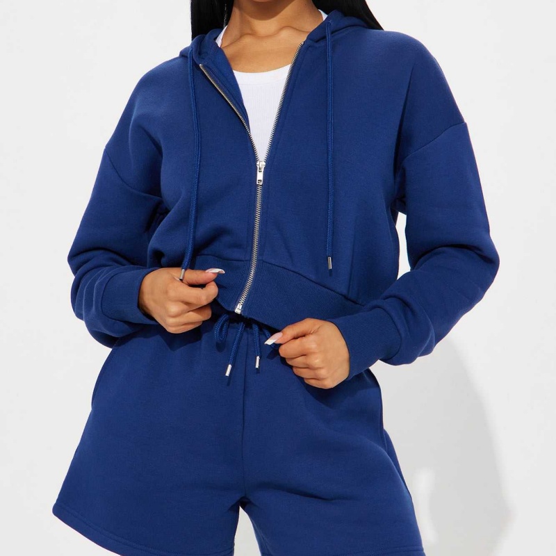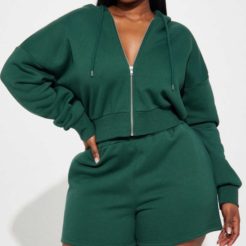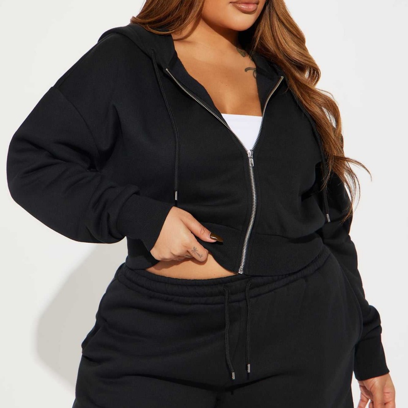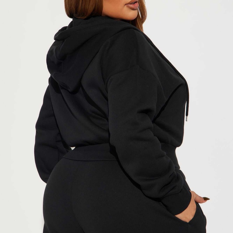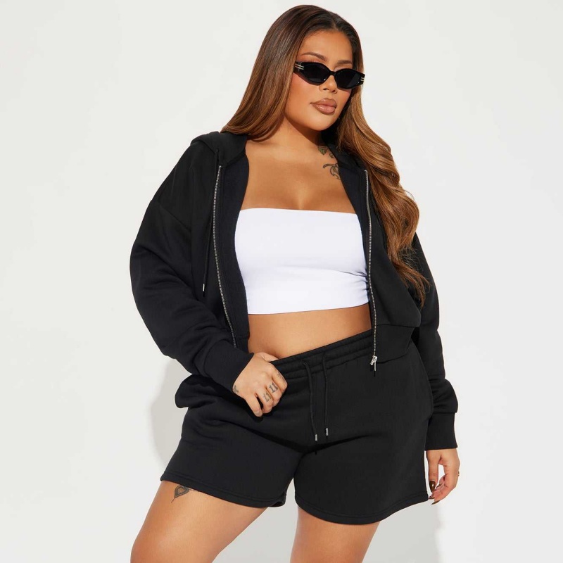 Black Wool Hoodie Set Embroidered Zip-Up Cropped Shorts 2-Piece Women's Hoodie Set
