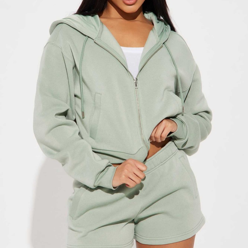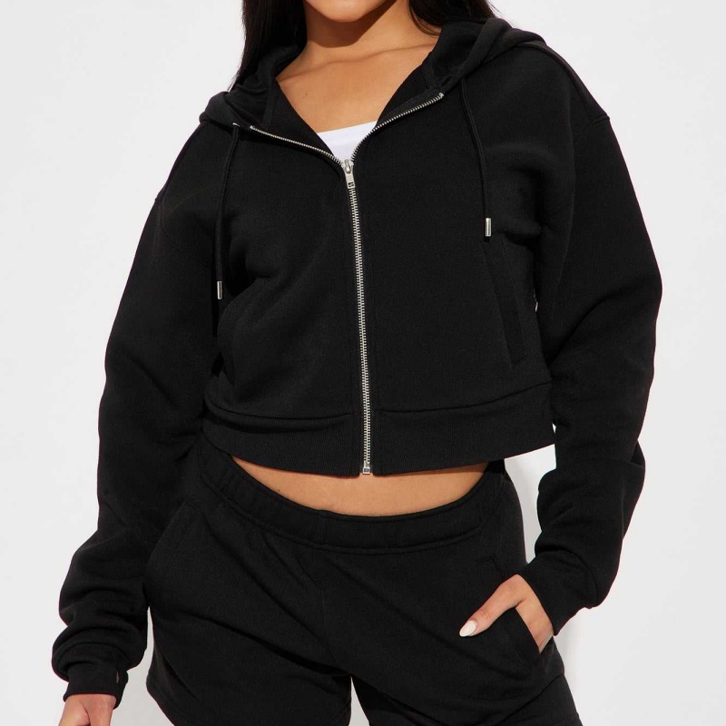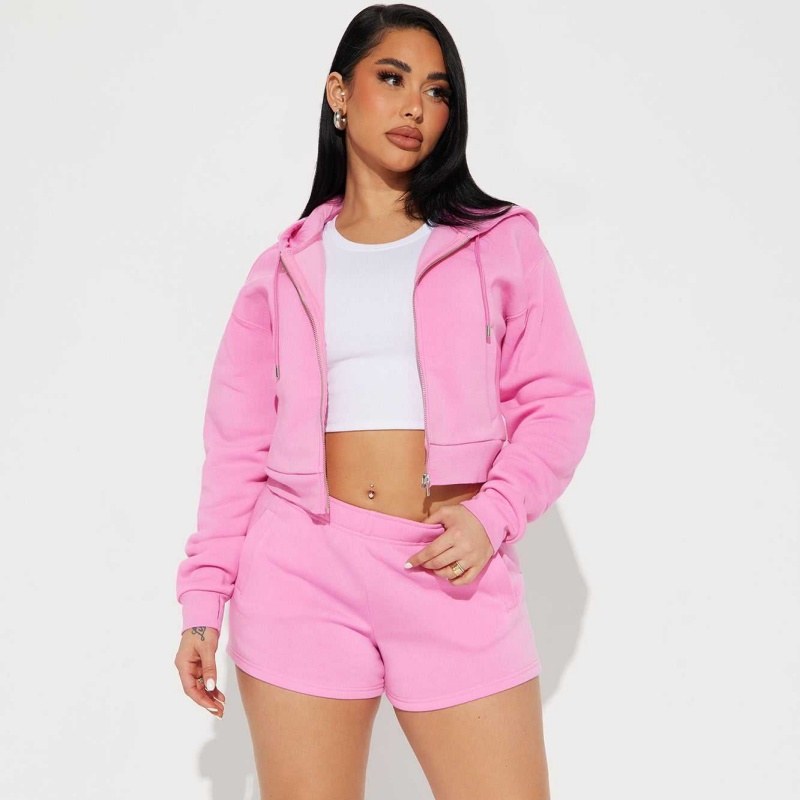 Pink Cropped Hoodie Set Zip-Up Short Style 2-Piece Jogging Women's Hoodie Set