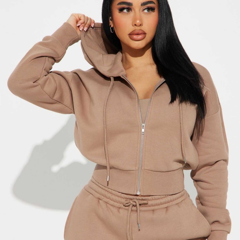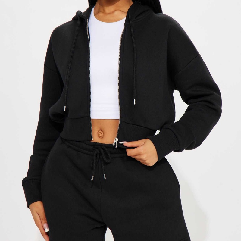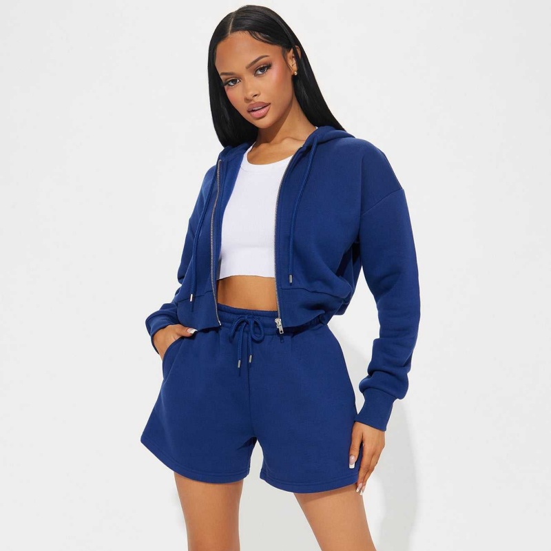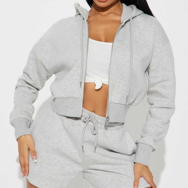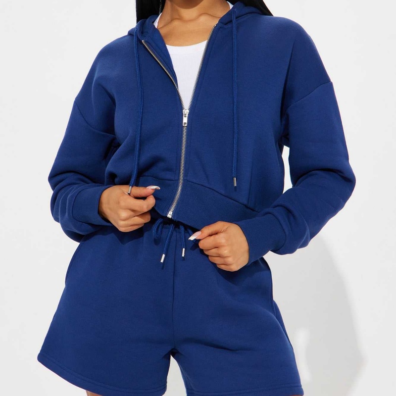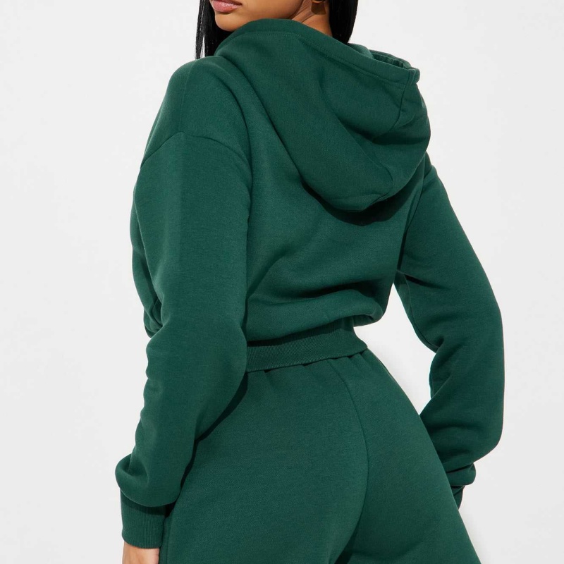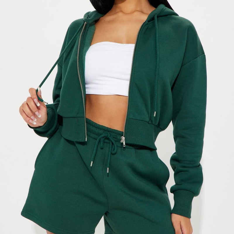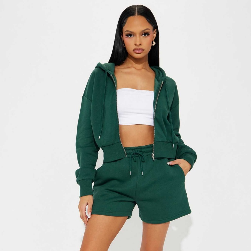 Green French Terry Hoodie Set Gym Cropped Zip-Up Shorts 2-Piece Women's Hoodie Set
